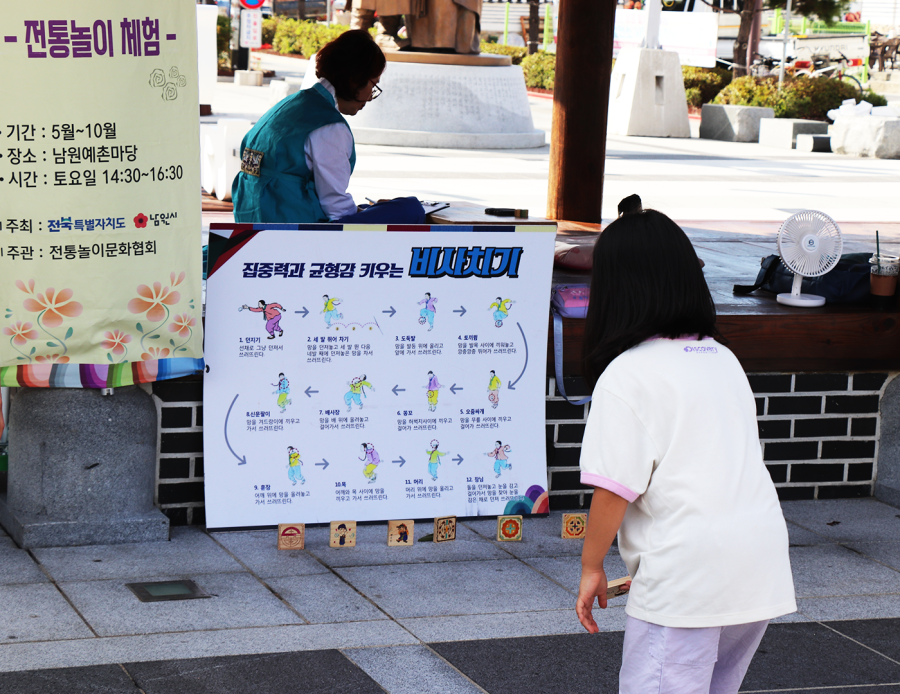 2 단계 : 오른 발등 위에 내 돌을 올려놓고 앞으로 가서 상대편 돌을 향해 던져서 쓰러뜨리기